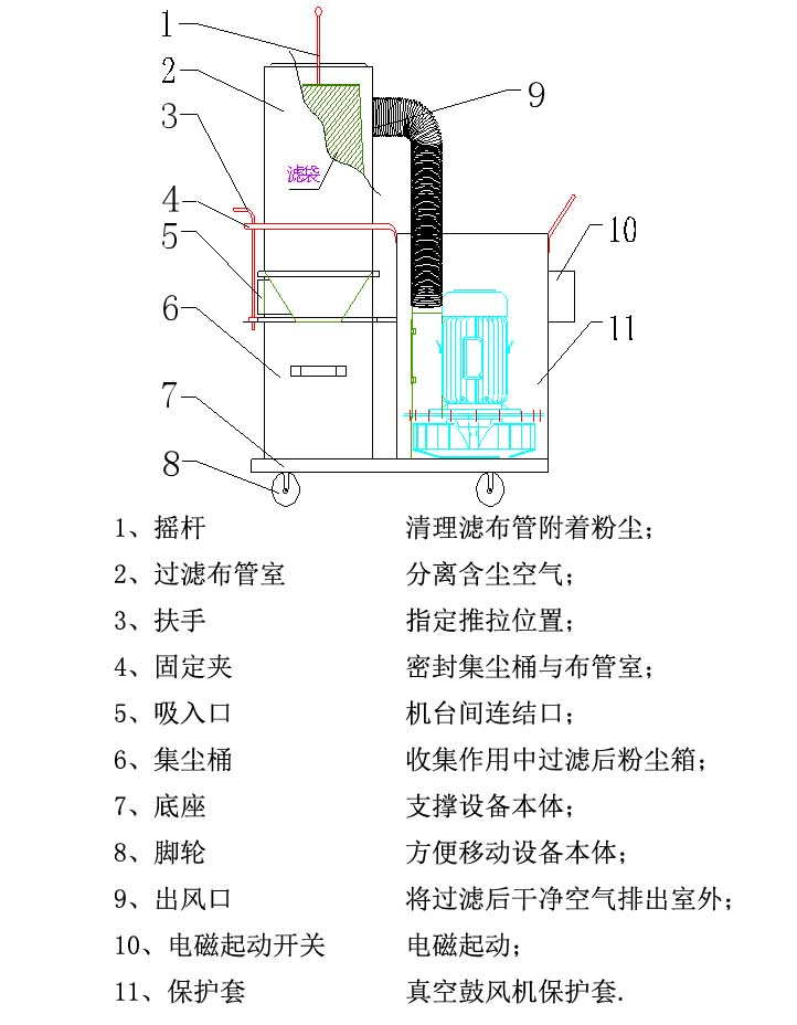 設備介紹: GSD系列單機除塵器是一種體積小、除塵效率高的就地除塵機組。該除塵器基本結構由風機、過濾器和集塵器三個部件組成,各部件均安裝在一個立式框架內,鋼板殼體,外形美觀,結構緊湊,運行可靠,使用方便。 單機除塵器用途:本系列產品廣泛用于鑄造業、陶瓷工業、玻璃工業及耐火材料、水泥建材、砂輪制造、化工制品、機械加工等行業除塵。該產品對比重較大的金屬切屑,鑄造用砂,如車床、磨床、碳粉、顏料、膠木粉、塑料粉等,以及比重較大的非纖維性粉塵均有良好的除塵效果。 設備結構: GSD手動系列包含以下組成部分: 1、主體部分含有:風機室、過濾室、收灰室 2、其它輔助系統:手動清灰桿、粉塵收集箱、濾材、電控控制器; 特點:操作簡單,維護方便;占地面積小, 靈活性大(可根據實際情況或客戶要求,設備可設計為防爆型或非防爆型) GSD自動系列包含以下組成部分: 1、主體部分含有:風機室、過濾室、收灰室 2、其它輔助系統:進口脈沖閥、儲氣包、粉塵收集箱、濾材、含PLC電控控制器; 特點:操作簡單,便捷;無需停機收塵,可長時間連續作業;靈活性大(可根據實際情況或客戶要求,設備可設計為防爆型或非防爆型) 高靜壓示意圖:
